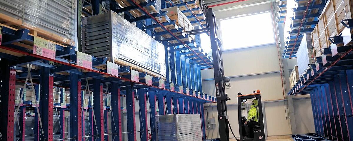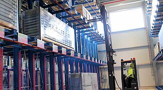 Door de investering in de nieuwe expeditiehal heeft Kardex haar opslagcapaciteit aanzienlijk verhoogd. De onderneming slaat daar de onderdelen en bouwgroepen voor haar eigen intralogistieke systemen op, voordat ze naar de klanten worden verzonden. In totaal bieden negen draagarmstellingen van OHRA met een lengte van max. 48 meter op vier opslagniveaus voldoende ruimte voor de 1.250 tot 4.300 millimeter lange pakstukken. Elke draagarm draagt daarbij max. 1.250 kilogram, elke staander max. 3.750 kilogram per zijde. Door het gebruik van een zijstapelaar kon Kardex de gangpaden tussen de draagarmstellingen smal houden en zo een hoge ruimtebenutting tot stand brengen. De draagarmstellingen worden aangevuld door een standaard palletstelling en twee dubbeldiepe palletstellingen, elk met een legbordbelasting van 2.400 kilogram. De dubbeldiepe stellingen bieden daarbij plaats aan pakstukken met een diepte van 3,2 meter en een gewicht van max. 1,5 ton.